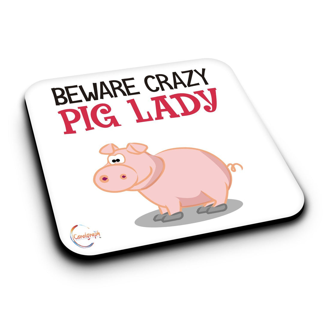 ER433 Beware Crazy Pig Lady Novelty Present Gift Printed MDF Wooden Coaster