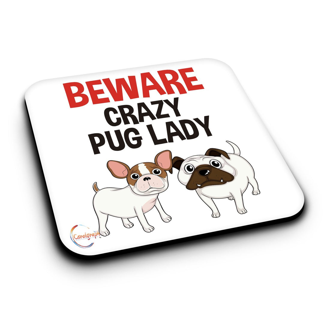ER430 Beware Crazy Pug Lady Novelty Present Gift Printed MDF Wooden Coaster