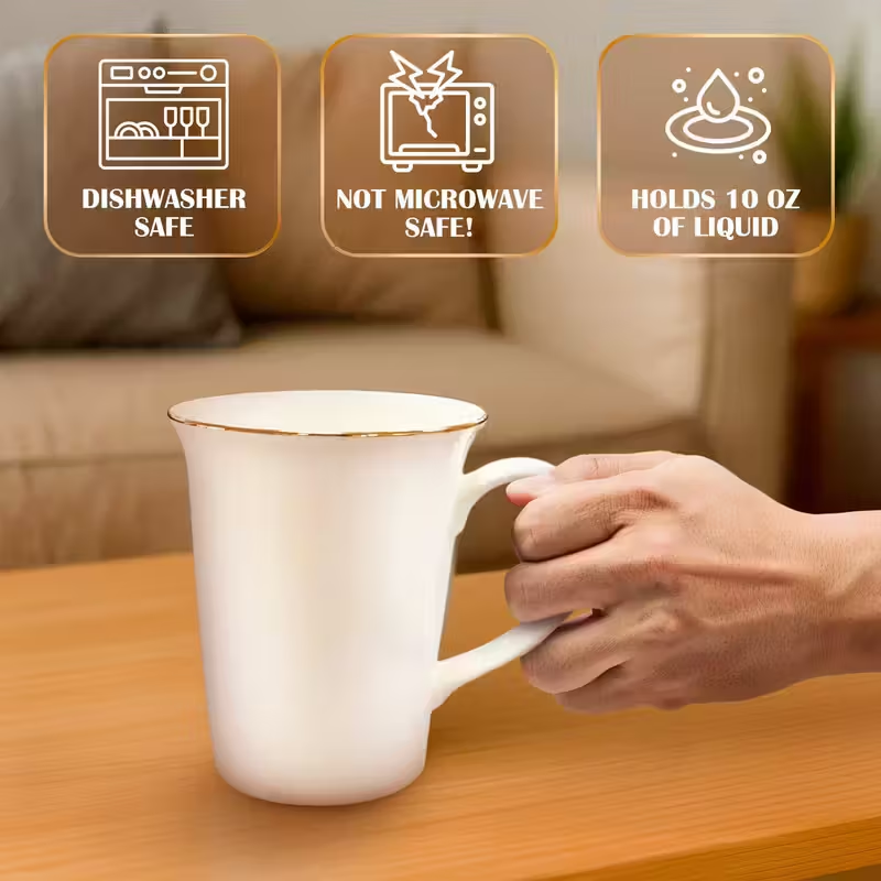 Set of 6 Elegant Fine Bone China Mug with Gold Rim Enjoy your favourite beverages in style with this elegant white Bone China mug from Coralgraph Inc, beautifully accented with a delicate golden rim. Its glossy finish and lightweight design make it perfect for everyday luxury.A classic choice for home, office, or gifting – make every sip a stylish experience. ️ Please Note: This mug is not microwave safe due to the metallic golden rim. It is, however, dishwasher safe for convenient cleaning.