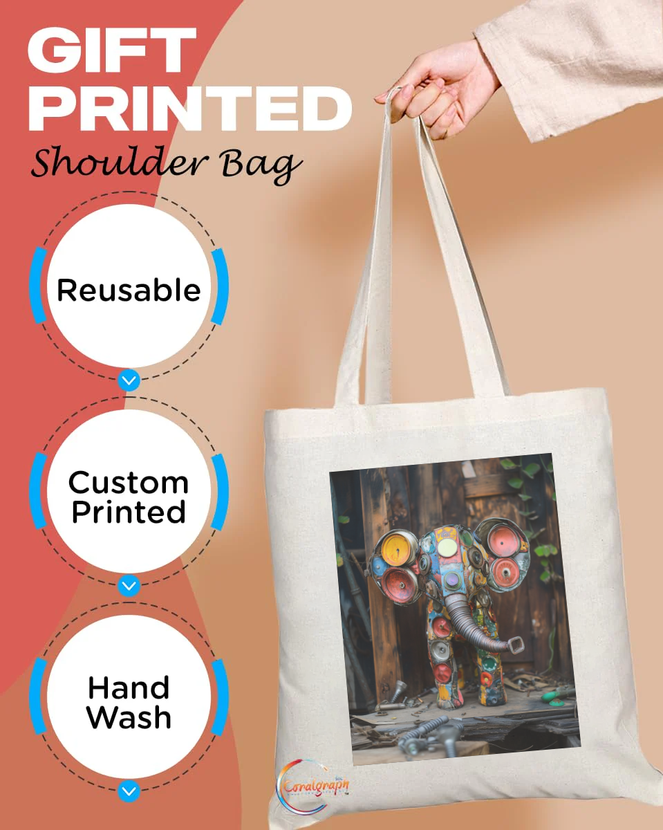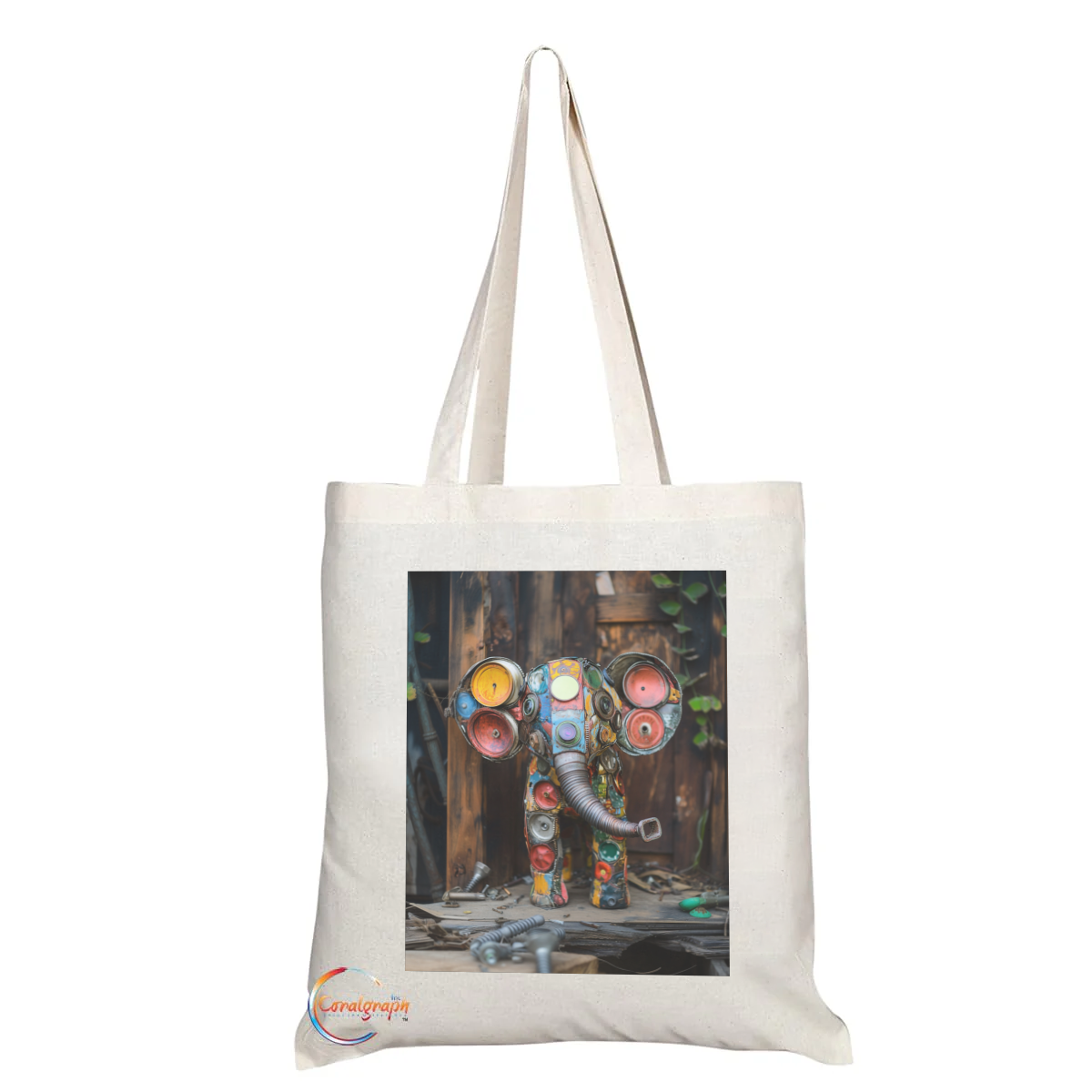 Add a touch of industrial charm to your everyday carry with our Scrap Metal Elephant Art Tote Bag, featuring a unique and vibrant design of an elephant sculpture made from colorful recycled metal parts. A true conversation starter, this tote is both artistic and functional.