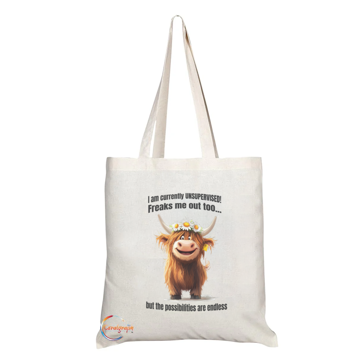Let your playful side shine with this hilarious and heartwarming tote bag featuring a flower-crowned Highland cow and the caption: "I am currently unsupervised! Freaks me out too… but the possibilities are endless."