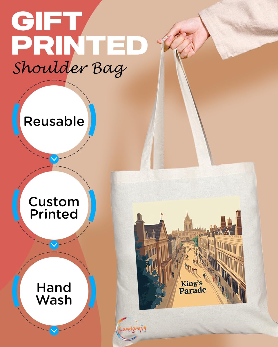 Natural Reusable Shopping Souvenir Tote Bag Featuring Cities and Landmarks in United Kingdom (Cambridge Kings Parade)